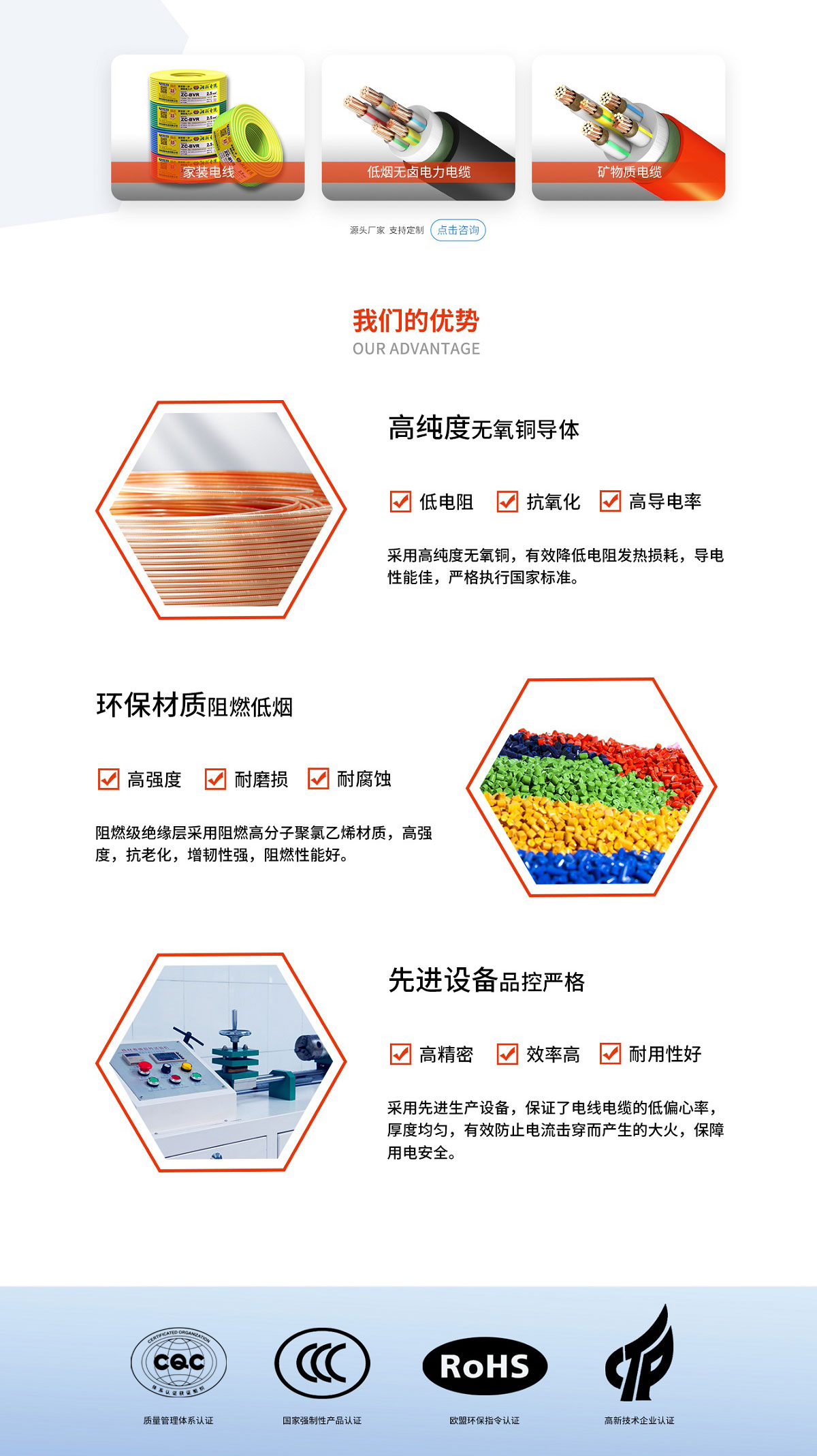 公司擁有國內(nèi)一流的電線電纜生產(chǎn)和檢測設(shè)備,以科學(xué)的經(jīng)營管理理念,引進高級專業(yè)技術(shù)及管理人才,組建實力雄厚的技術(shù)研發(fā)和企業(yè)管理團隊,建立高標準質(zhì)量管理體系,對生產(chǎn)全過程實現(xiàn)智能化數(shù)字化管理。公司是國家高新技術(shù)企業(yè)、國家級專精特新“小巨人”企業(yè)、CNAS國家重點實驗室、湖南省企業(yè)技術(shù)中心、長沙市技術(shù)中心、湖南省新材料企業(yè)、湖南省綠色制造體系示范單位(綠色工廠)、湖南省制造業(yè)品牌培育試點企業(yè)、湖南省產(chǎn)融合作制造業(yè)重點企業(yè)、湖南省守合同重信用企業(yè)、長沙市專精特新小巨人企業(yè)、長沙市技術(shù)創(chuàng)新中心(產(chǎn)業(yè)引導(dǎo)類)、湖南省制造業(yè)品牌培育示范企業(yè)、瀏陽市誠信企業(yè),先后通過國家強制性產(chǎn)品認證(CCC認證),全國工業(yè)生產(chǎn)許可證,歐盟CE認證、質(zhì)量管理體系認證(ISO9001)、中國職業(yè)健康安全管理體系認證(ISO45001)、環(huán)境管理體系認證(ISO14001)、知識產(chǎn)權(quán)管理體系認證、武器裝備質(zhì)量管理體系認證、IATF16949:2016質(zhì)量管理體系認證、歐盟環(huán)保體系認證、礦用產(chǎn)品安全認證、能源管理體系認證,并榮獲CCTV《品牌中國》重點推薦品牌、品牌強國國貨之光、中國電纜行業(yè)十大品牌、工程建設(shè)推薦產(chǎn)品、質(zhì)量檢驗國家標準合格產(chǎn)品、綠色環(huán)保產(chǎn)品、湖南省知名品牌、AAA企業(yè)等系列榮譽,得到業(yè)界的廣泛認可與贊譽。