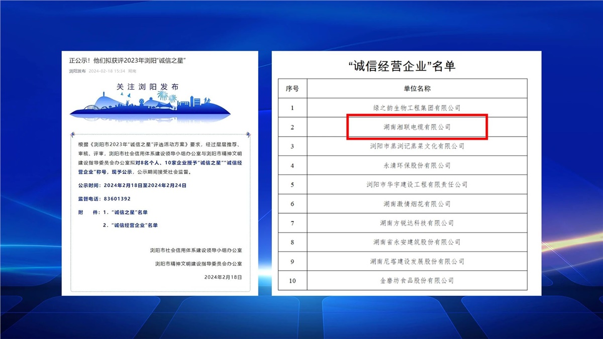 2月,瀏陽(yáng)市社會(huì)信用體系建設(shè)與瀏陽(yáng)市精神文明建設(shè)指導(dǎo)委員會(huì)辦公室聯(lián)合開(kāi)展的瀏陽(yáng)市2023年“誠(chéng)信之星”評(píng)選進(jìn)行公示,湖南湘聯(lián)電纜有限公司成功入選,成為2023年“誠(chéng)信之星”。