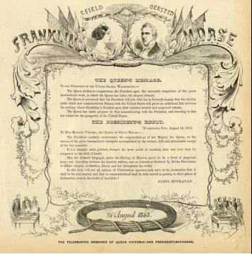 幾個(gè)小時(shí)后,世界一片歡騰,全世界的人們都在興奮的等待著這一刻。1858年8月16日,維多利亞女王發(fā)給美國(guó)總統(tǒng)布坎南的賀電通過(guò)海底電纜傳到北美,布坎南向英國(guó)女王回電,同時(shí),禮炮鳴放100響,慶祝人類(lèi)這一偉大的歷史時(shí)刻。