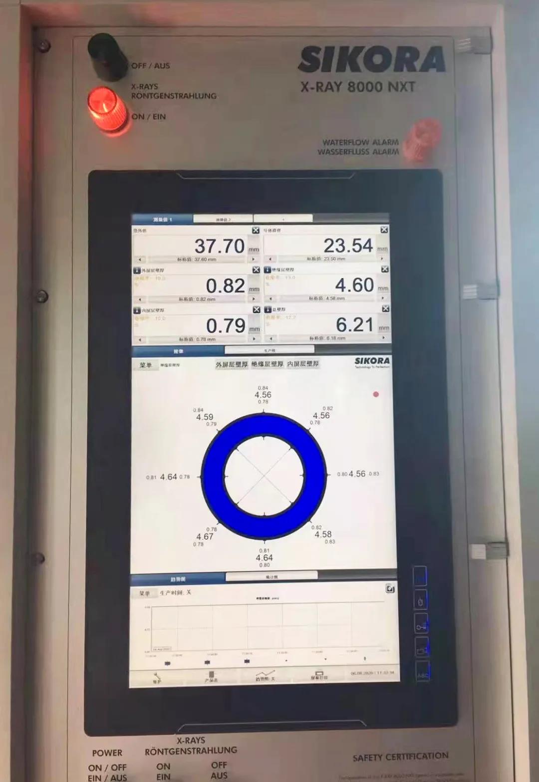 “嚴把質量關,產(chǎn)品質量有保證?!惫具€大力引進德國進口西科拉交聯(lián)管內電纜偏心壁厚分層辨析系統(tǒng),在每一個掃描器上配備新一代的雙接收器的測偏儀,保證儀器在任何激烈電纜抖動情況下也能進行精確可靠的檢測,并采用全新的門控技術控制X射線的發(fā)射,X射線的轉換效率更高,操作溫度更低,從而保護射線管,生產(chǎn)過程實時監(jiān)控中壓電纜內屏,絕緣,外屏三層擠出時采集八點厚度,精準實時監(jiān)控絕緣外徑,從而提供高標準產(chǎn)品。