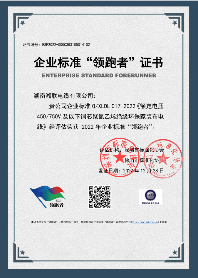 喜訊 | 湘聯(lián)電纜榮獲2022年全國(guó)企業(yè)標(biāo)準(zhǔn)“領(lǐng)跑者”稱號(hào)