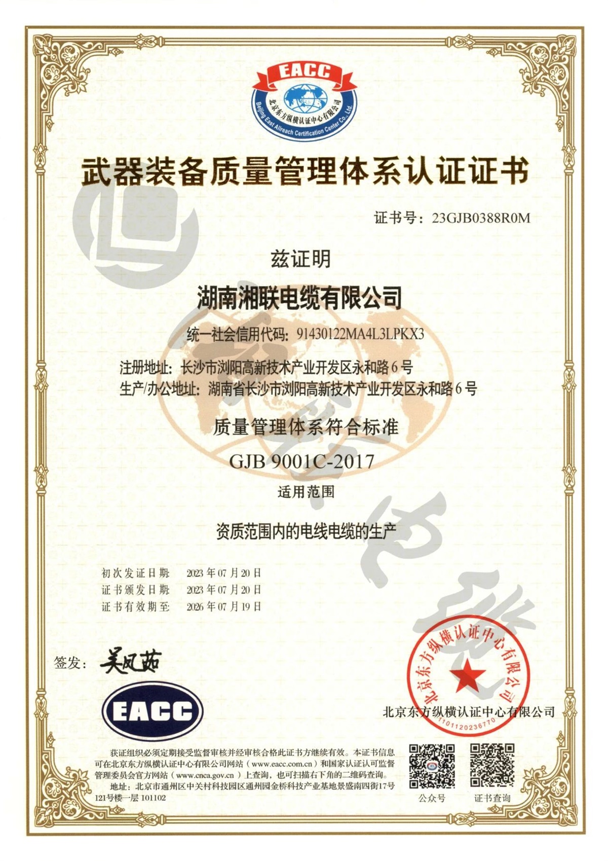 2023年,湘聯(lián)電纜順利通過(guò)國(guó)軍標(biāo)質(zhì)量管理體系認(rèn)證,獲得《武器裝備質(zhì)量管理體系認(rèn)證證書》,質(zhì)量管理體系符合:GJB9001C-2017標(biāo)準(zhǔn),這表明湘聯(lián)電纜的質(zhì)量管理體系符合武器裝備質(zhì)量管理體系的標(biāo)準(zhǔn)及相關(guān)要求,具備軍品研發(fā)、生產(chǎn)和服務(wù)的質(zhì)量管理能力。